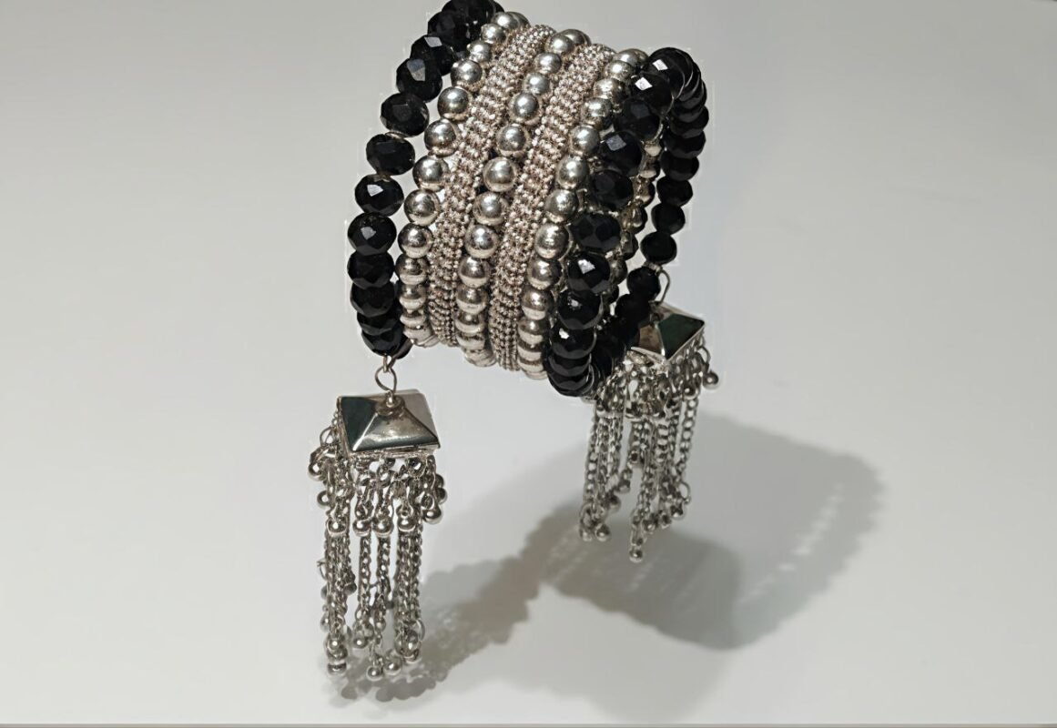 Oxidised Silver Black Beads Statement Bangle with Chain Tassels | Traditional Ethnic Jewellery | ADRI TRIBE