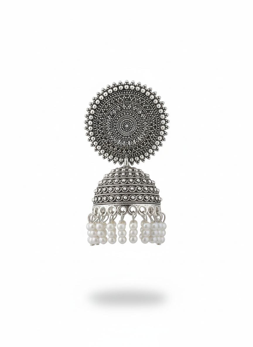 Expertly crafted with intricate oxidised patterns on the dome and finished with delicate layers of white pearl drops, these earrings bring out timeless elegance and authentic ethnic charm.