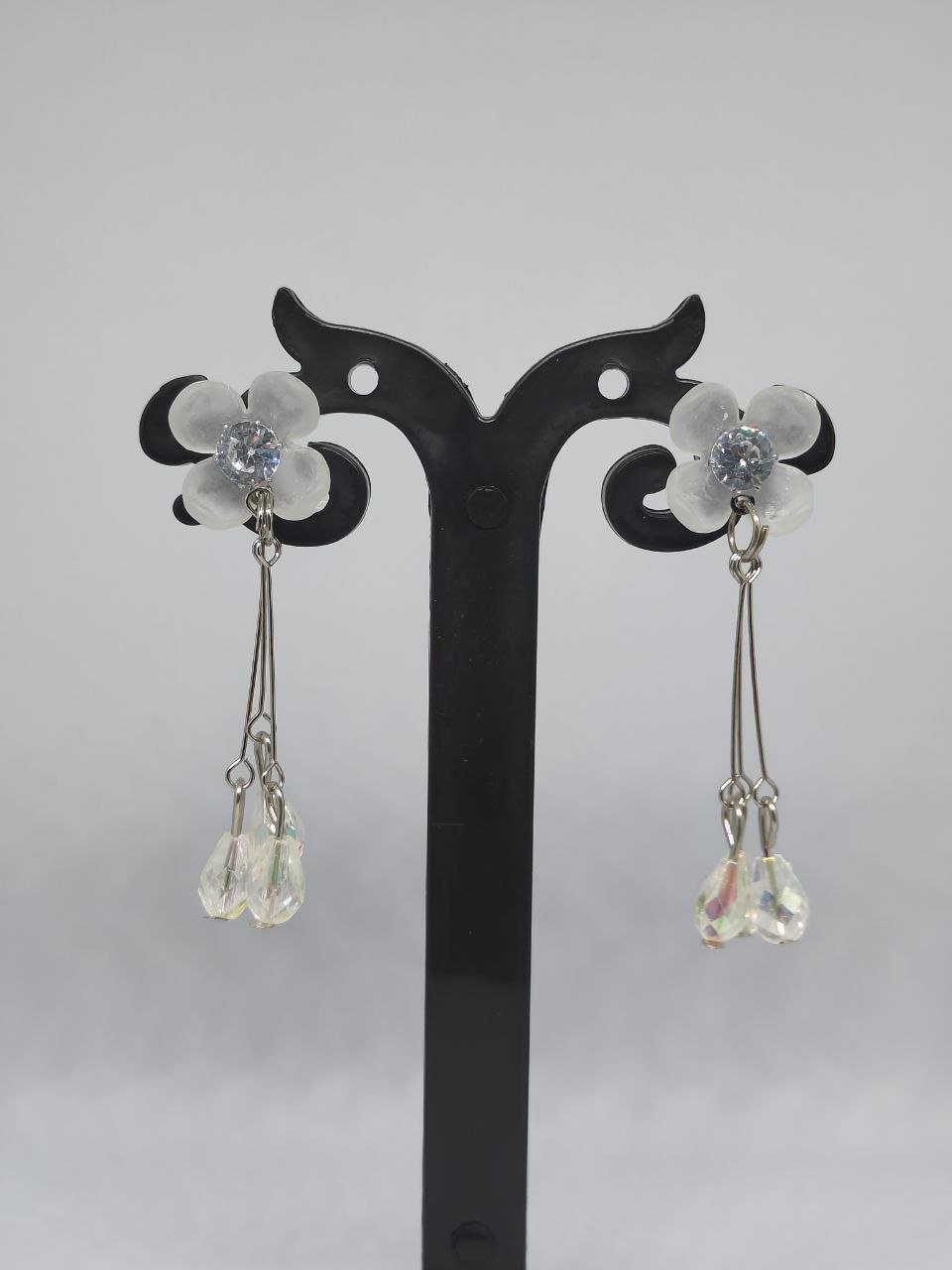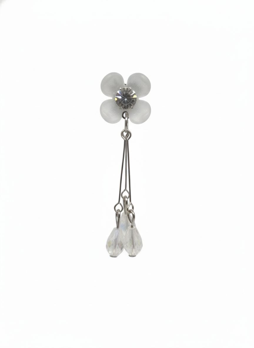 These earrings feature a frosted floral stud with a sparkling crystal center, paired with lightweight hanging crystal drops that reflect light beautifully. The slim drop design offers movement and shine without feeling heavy, making them perfect for both daily wear and special occasions.