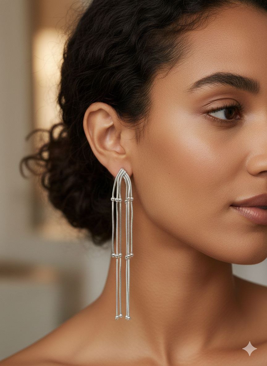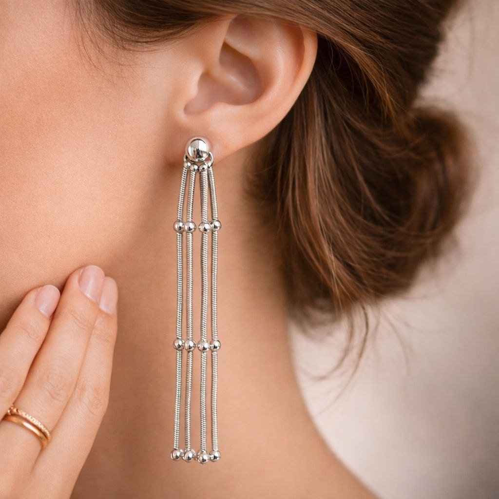 The earrings feature multiple fine chains arranged in a layered drop style, finished with subtle bead detailing that adds balance and shine.