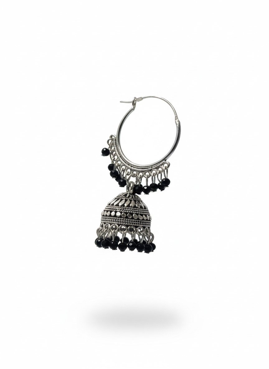 Make a bold style statement with these Oxidised Silver Hoop Jhumka Earrings with Black Beads.