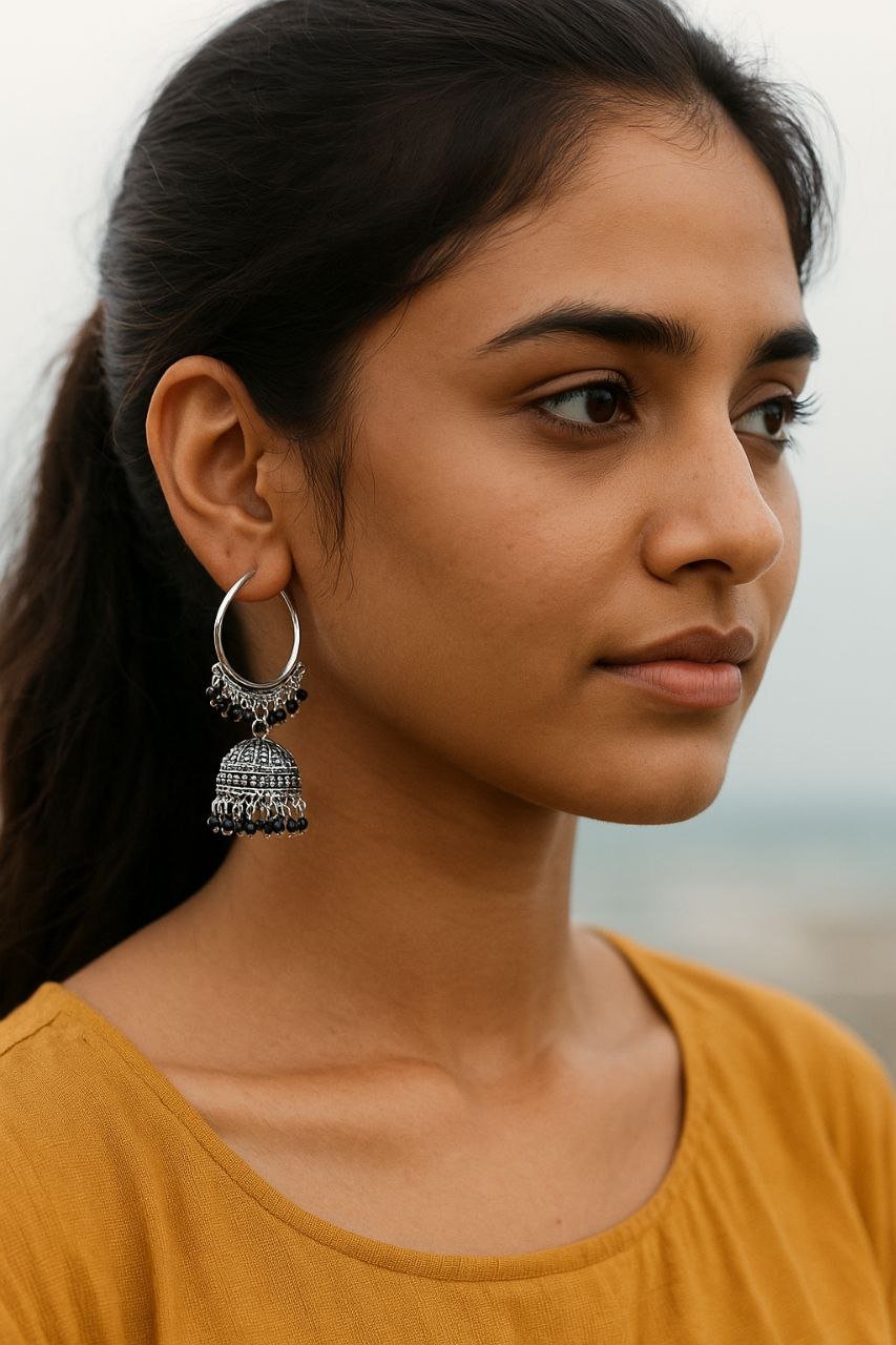 black earrings, oxidised jhumka, hoop earrings, silver jewellery, ethnic wear, festive accessories