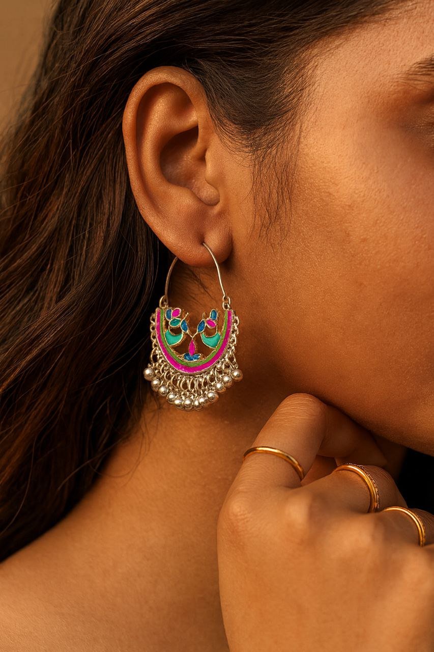 Add a splash of color to your ethnic look with these Handcrafted Meenakari Tribal Hoop Earrings by ADRI TRIBE. Featuring vibrant enamel detailing in pink, blue, and green hues along with ghungroo drops in silver finish — this pair is a statement piece that blends tradition with a bohemian touch.