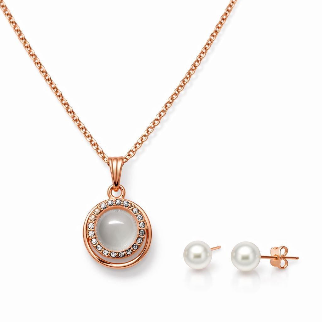 Pearl circle pendant necklace set with matching earrings in rose gold and silver finish.