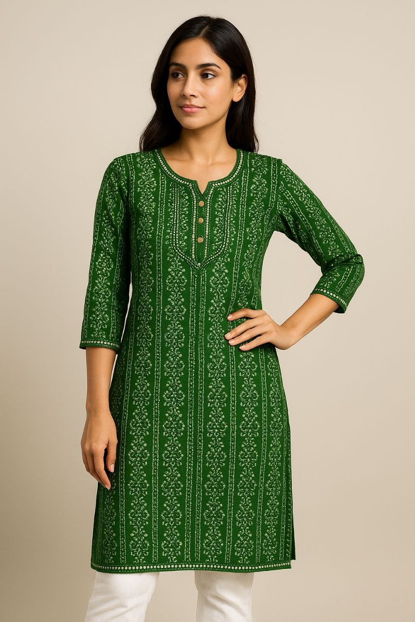 Elegant green cotton kurti with traditional print, round neckline & button placket 🌿✨