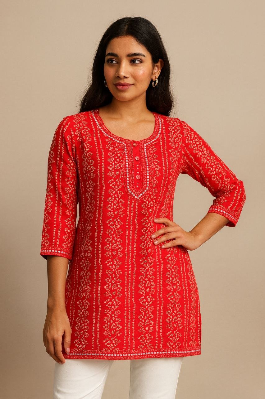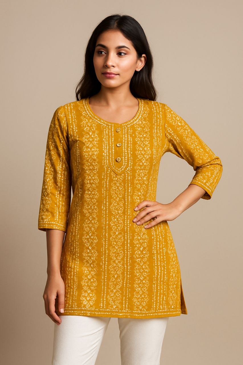 Crafted from soft, breathable cotton fabric, it features a classic ethnic print, 3/4 sleeves, and a round neckline with button detailing, making it perfect for college, casual outings, or daily wear.